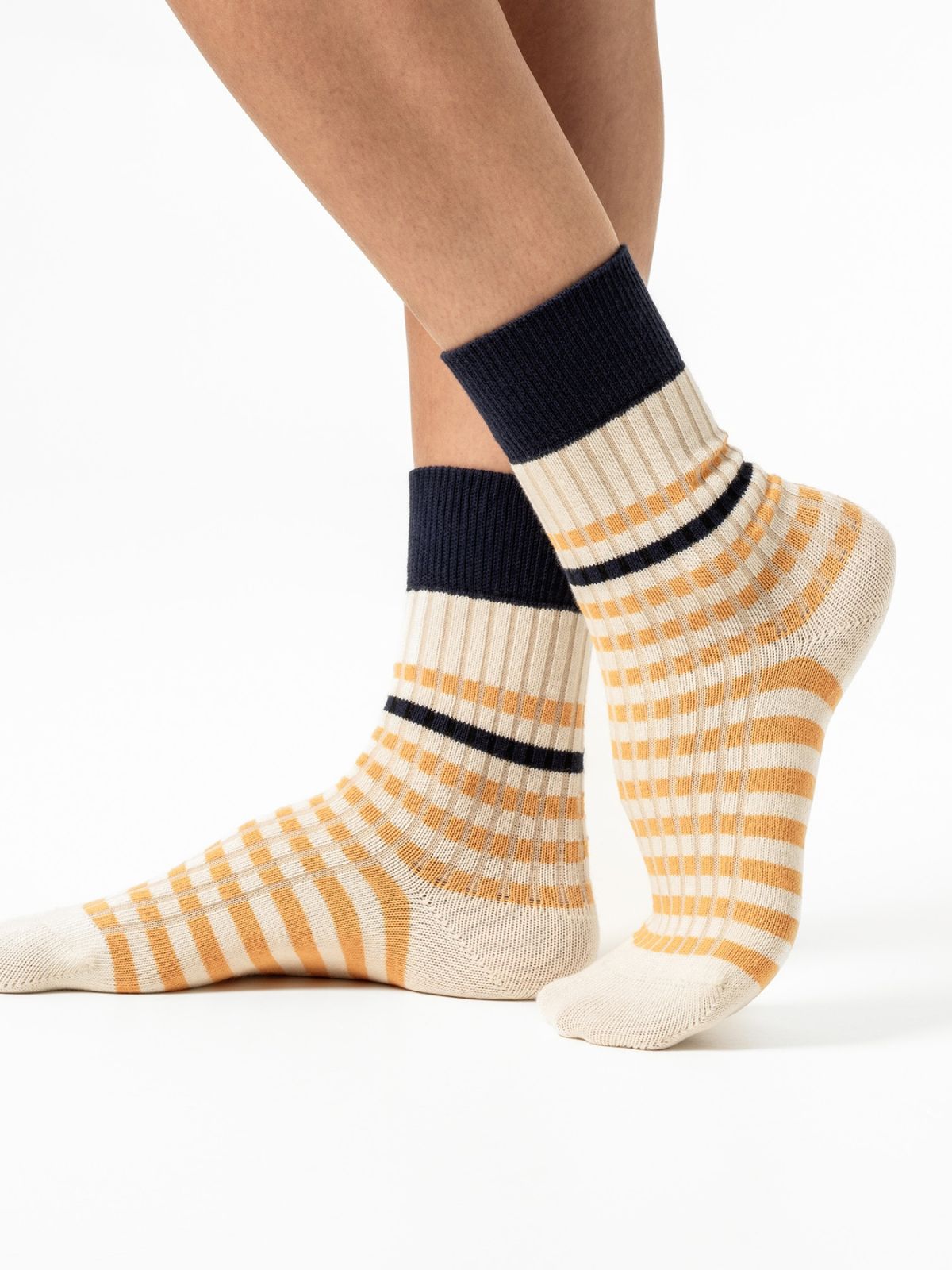 Șosete unisex din 98% bumbac organic, de inspirație marină, cu o bandă elastică lată care asigură o fixare foarte bună pe picior.